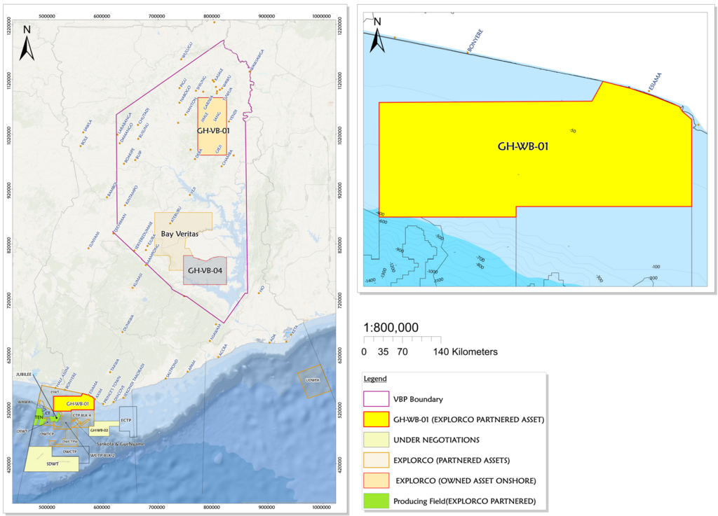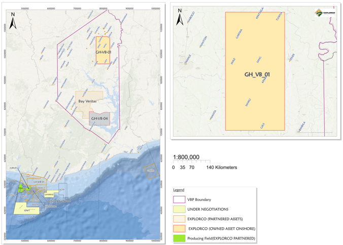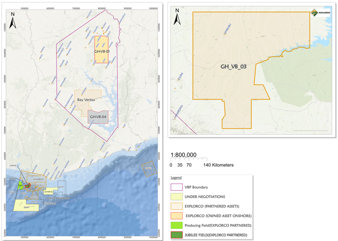The GH-VB-03 block covers approximately 7,017 km² and is operated by Bay Veritas (75%) and partnered by GNPC (15%), and Explorco (10%). The block features both structural and stratigraphic traps, with exploration potential in the Tonian–Cryogenian-aged Kwahu-Bombuaka sequence. Though unproven, alternating sandstone and mudstone intervals in this sequence are promising Neo-proterozoic plays. Initial studies estimate mid-case prospective hydrocarbon resources of about2 billion barrels.
