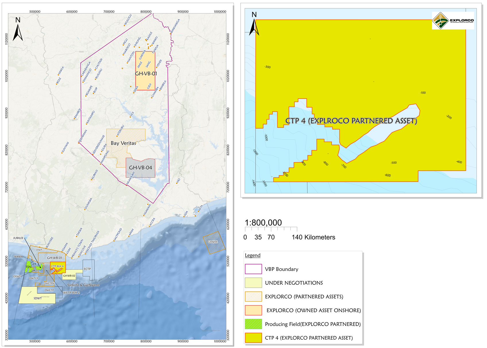 The Cape Three Points - Block 4 (CTP-Block 4) is situated North of the Sankofa-Gye Nyame (SGN) field. It covers an area of about 930 sq. km at water depths between 300m and 1500m. The Partnership of the block is made up of ENI Ghana Exploration & Production Limited (42.47%) as the Operator, Vitol Upstream Tano Limited (33.98%), Woodfields Upstream Limited (9.56%), GNPC (10.0%), and Explorco (4.0%).